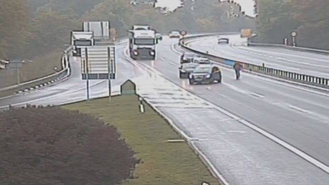 Plötzlich rollt ein Fahrzeug quer über die Autobahn in Richtung Mittelleitplanke. Ein Mann rennt hinterher, kann es aber nicht einholen. Im Hintergrund rauschen LKW und Autos heran. Lebensgefahr für alle Beteiligten.
